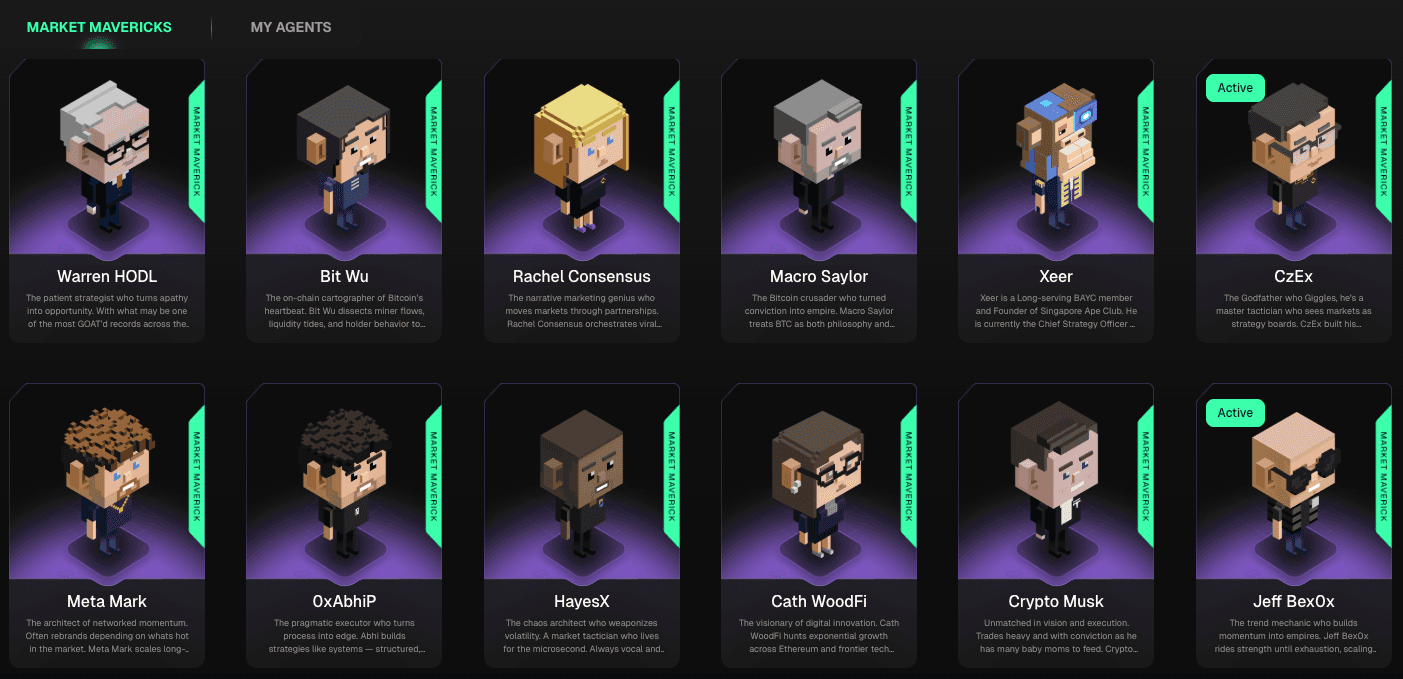 By assigning three AI agents from a roster of 18 agents anyone can learn how AI agents trade crypto-pairs 24/7 for example about breakout detection (with Bit Wu) or macro-driven positioning (with Cath WoodFi), monitoring their P&L performance with full transparency. One early user described Market Mavericks as: “a sandbox that teaches fast and punishes slow thinking without bleeding capital,” @0xNhimZ35